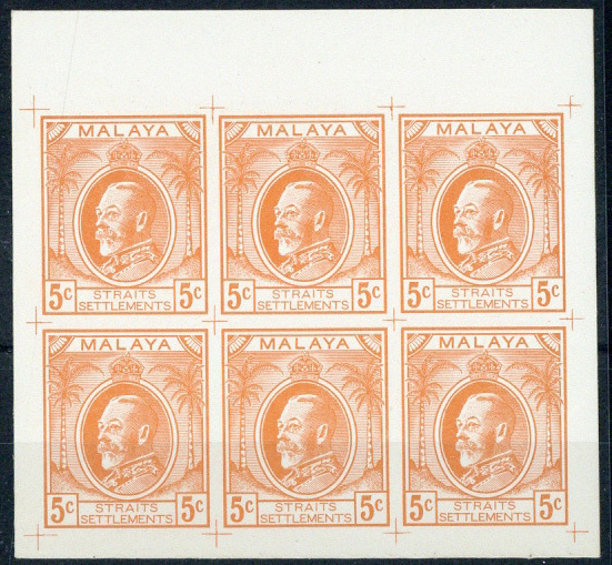 5c. with three-quarter view King George V in uniform, "malaya" in positive lettering on white background and vignette oval half in solid and half cross-hatched, a marginal block of six in orange with guide croses in each corner, fine. (Norris Type U)
