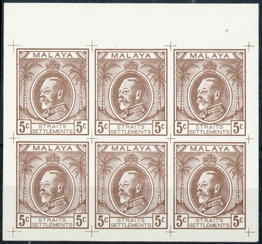 5c. three-quarter view of King George V in uniform with oval background cross-hatched, a marginal block of six in brown with guide crosses in each corner, fine. (Norris Type V)
