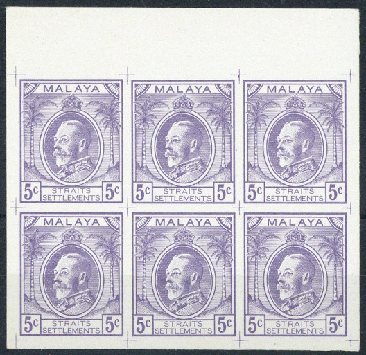 5c. three-quarter view of King George V in uniform with oval background cross-hatched, a marginal block of six in lilac with guide crosses in each corner, fine. (Norris Type V)