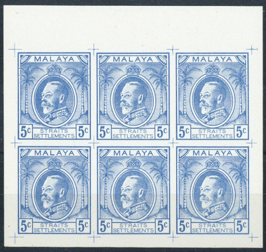 5c. three-quarter view of King George V in uniform with oval background cross-hatched, a marginal block of six in blue with guide crosses in each corner, fine. (Norris Type V)