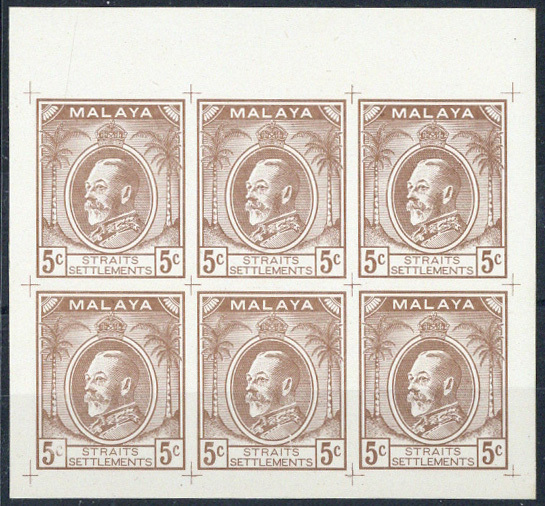 5c. three-quarter view of King George V in uniform with "malaya" in negative lettering on a coloured background, and vignette oval background cross-hatched, a marginal block of six in brown, fine. (Norris Type X)