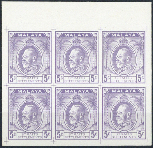 5c. three-quarter view of King George V in uniform with "malaya" in negative lettering on a coloured background, and vignette oval background cross-hatched, a marginal block of six in lilac, fine. (Norris Type X)