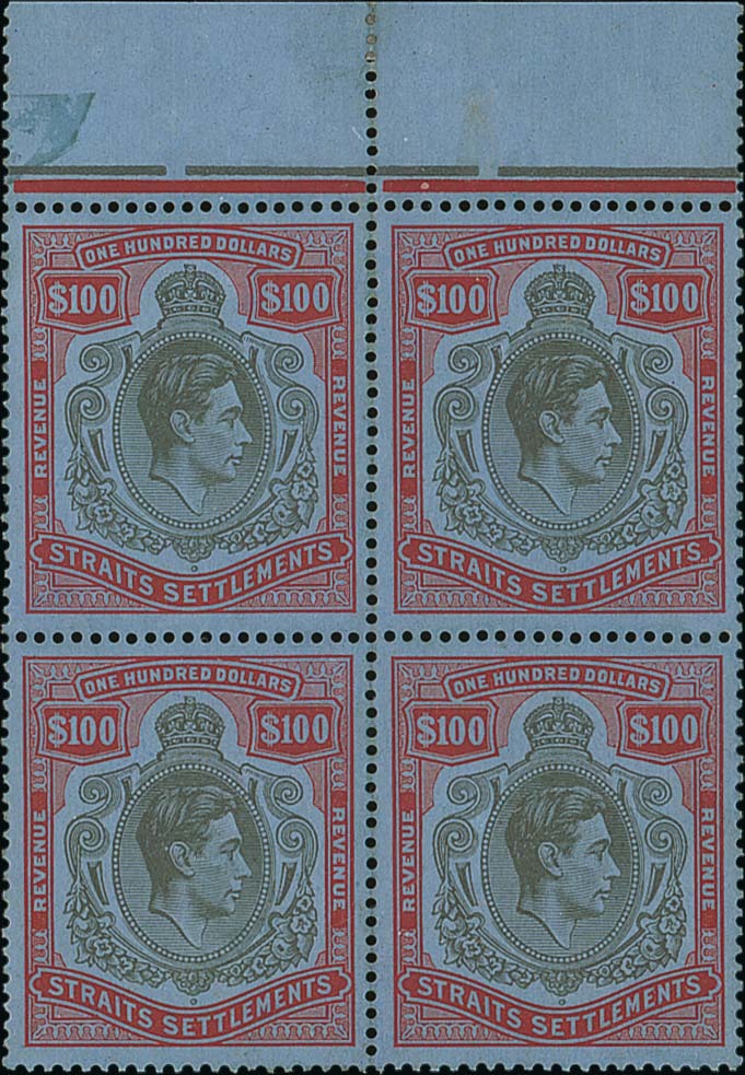1938 $100 black and carmine on blue, block of four from the top of the sheet, regummed, nevertheless fresh appearance and exceedingly rare. Possibly the largest known multiple. Barefoot 59. Photo