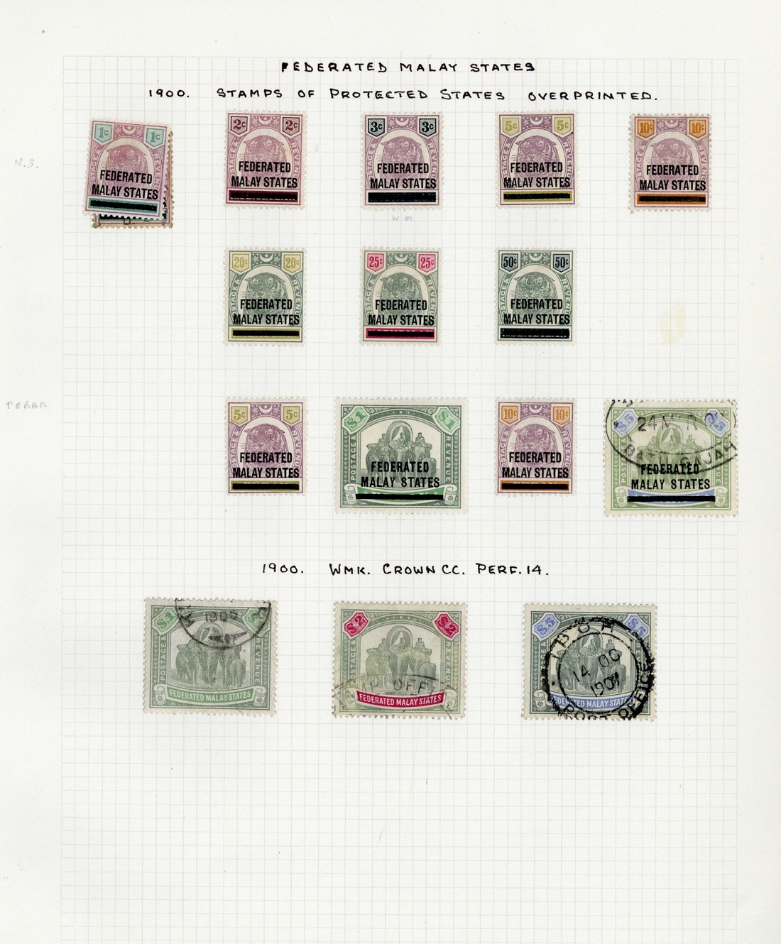 A mint and used collection on leaves and housed in a carton, all States with 1948 Wedding, also included are Federated Malay States including 1900 on Negri Sembilan 1c. to 50c. and on Perak 5c., 10c. and $1 mint, 1900 CC $1 and $5 used, 1904-12 $1, $2 and $5 mint and 1922-34 Script $1 (both), $2 and $5 mint, Malayan Postal Union 1936-38 1c. to 50c. mint, 1945-49 1c. to 20c. mint and 1951-63 1c. to 20c. mint; Johore 1918-20 MCA $3, $4 and $5 used, 1949-55 1c. to $5 used and Postage Due 1938 1c. to 12c. mint; Johore 1949-55 1c. to $5 and 1960 1c. to $5 mint; Kedah 1937 10c. to $5, 1950-55 1c. to $5, 1957 1c. to $5 and 1959-61 1c. to $5 mint; Kelantan 1937-40 1c. to $5 mint and to $2 used, 1951-55 1c. to $5 and 1957-63 1c. to $5 mint; Malacca 1954-57 1c. to $5 mint and used, 1957 1c. to $5 mint and 1960-62 1c. to $5 mint; Negri Sembilan 1935-41 1c. to $5, 1949-55 1c. to $5 and 1957-63 1c. to $5 mint; Pahang 1935-41 1c. to $5, 1950-56 1c. to $ and 1957-63 1c. to $5 mint; Penang1949-52 1c. to $5 mint and used, 1954-57 1c. to $5, 1957 1c. to $5 and 1960 1c. to $5 mint; Perak 1900 3c. on $1 used, 1935-37 1c. to $5 mint, 1938-41 to $5 used, 1950-56 1c. to $5 mint and used and 1957-61 1c. to $5 mint; Perlis 1951-55 1c. to $5 mint and to $5 used and 1957-62 1c. to $5 mint; Selangor 1935-41 1c. to $5 mint , 1941 $1, $2 and unissued $5, 1949-55 1c. to $5 and 1957-61 1c. to $5 mint; Trengganu 1922-41 MCA $5 and Script to $3, 1949-55 1c. to $5 and 1957-63 1c. to $5 mint; plus a range of Malaysia. Condition generally good to fine