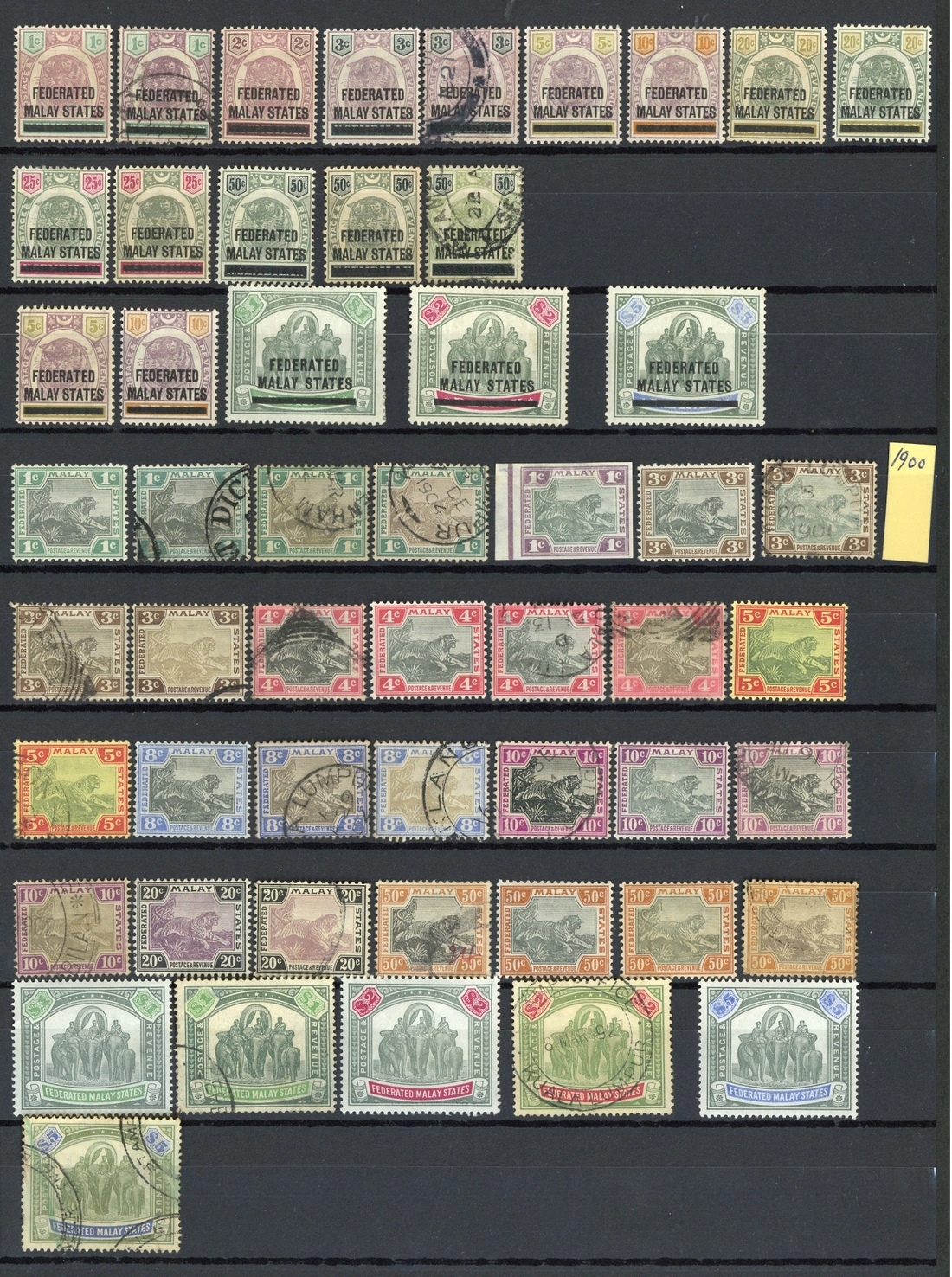 A mint and used collection housed on a blue stockbook, many hundreds, including Federated Malay States 1900 $1, $2 and $5 part original gum, 1900-01 1c. colour trial in green and purple, $1, $2 and $5 part original gum, Johore, Kedah 1912 $3, 1919 50c. on $2 and $1 on $3, 1921-32 $1, $3, $5, 1937 10c. to $5 mint and used sets, Kelantan 1911-15 to $25, 1921-28 to $1, 1937-40 1c. to $1, Negri Sembilan 1881 2c. brown (2), 1882 S.U. 2c. (without stops), Pahang 1889 2c., 10c., 1891 2c. on 24c., Perak 1895-99 set overprinted "specimen", 1900 set, Officials, Selangor 1881-82 2c. (2), 1882-83 2c. (2), 1891 2c. on 24c. (4), 1895-99 3c. to $25 overprinted "specimen", 1900 1c. on 5c., 1941 $1, $2, Trengganu1910-19 $5, 1921-41 $1, $3, $5, Postage Due 1937 set, Japanese Occupation, etc., chiefly good to fine