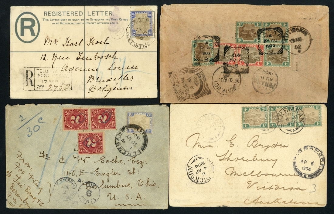 1902 (9 Aug.) envelope from Tapah to India bearing, on reverse, 1c. (4) and 4c. (2), all cancelled by Type D3 d.s. and showing Teluk Anson and Penang transit d.s. alongside; 1904 (6 Apr.) picture postcard from Seremban to Melbourne, bearing 1c. (3) tied by Type D6 c.d.s. and showing Port Dickson and Singapore transit d.s. alongside; 1906 (17 Sept.) 10c. registered envelope from Teluk Anson to Belgium, uprated with 8c., cancelled by Type R5 and showing Type R2 registration d.s.; and 1909 (30 May) envelope from Seremban to USA, bearing 8c. tied by Type D7, showing blue crayon "16" and "2/30c", New York 6c. due d.s. and with US Postage Due 2c. (3) cancelled in manuscript. An interesting group