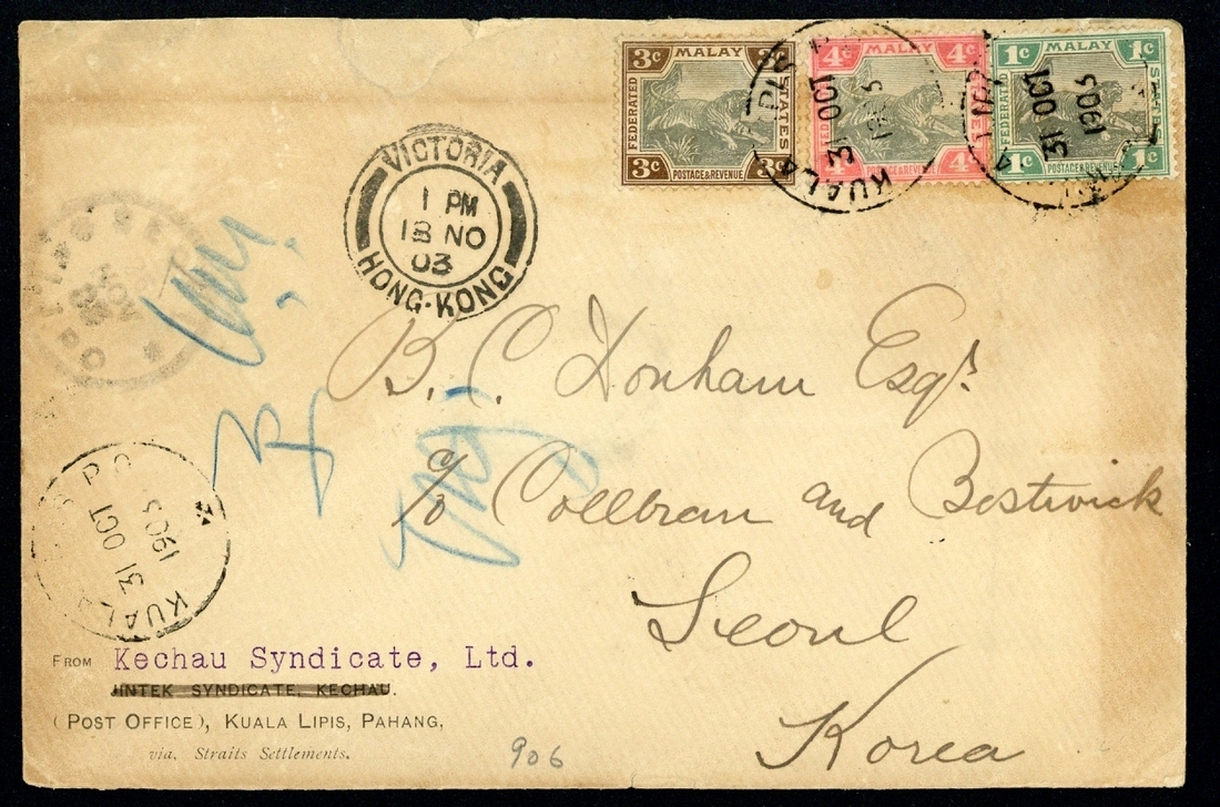 1903 (31 Oct.) envelope from Kuala Lipis to Seoul, bearing 1c., 3c. and 4c. tied by Type D4), showing Victoria Hong Kong (13.11) and arrival datestamps with, on reverse, Raub (31.10), Kwala Kubu (2.11), Singapore (4.11) and Nagasaki (20.11) transit datestamps; the envelope with some light overall discolouration. A rare destination