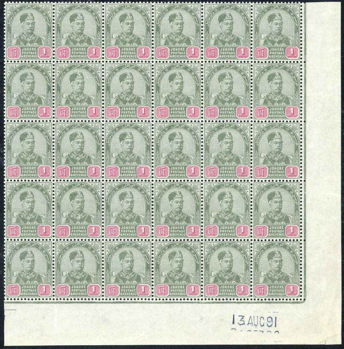 1891 Sultan Abu Bakar $1 green and carmine, unmounted mint block of thirty (6 x 5) from the lower right corner of the sheet; a few tiny wrinkles, fresh colour and fine. S.G. 27, £2,550