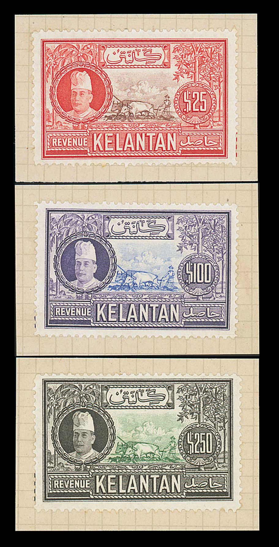 1950 $25 brown and red, $100 blue and violet and $250 green and black, all unused and each affixed to small piece, fine. Rare. Barefoot 2-4. Photo