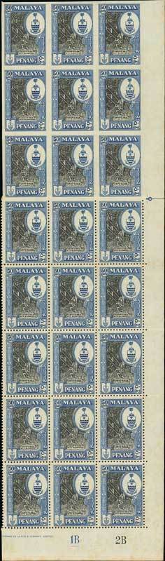 1960 (Mar.) 50c. black and blue, a lower right corner block of twenty-four (3x8; folded) with plate numbers and part imprint, the top block of nine imperforate, unused with almost full original gum; some tropicalisation/foxing, predominantly on reverse and barely affecting appearance. A major Q.E. rarity and a startling multiple of this error. S.G. 62a, £3400+. Photo