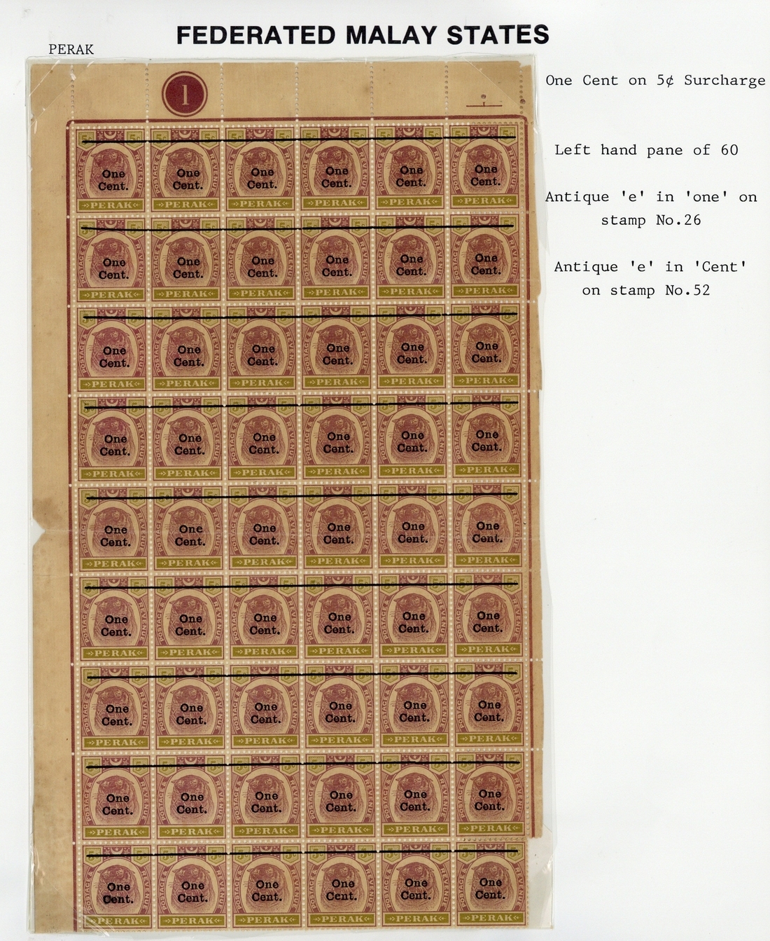 1900 "One/Cent." on 5c. dull purple and olive-yellow, a top left corner pane of sixty (6x10) with plate number, [26] showing antique "e" in "One" and [52] showing antique "e" in Cent"; toned and horizontal crease though the fifth row. S.G. 83/a/b, £359