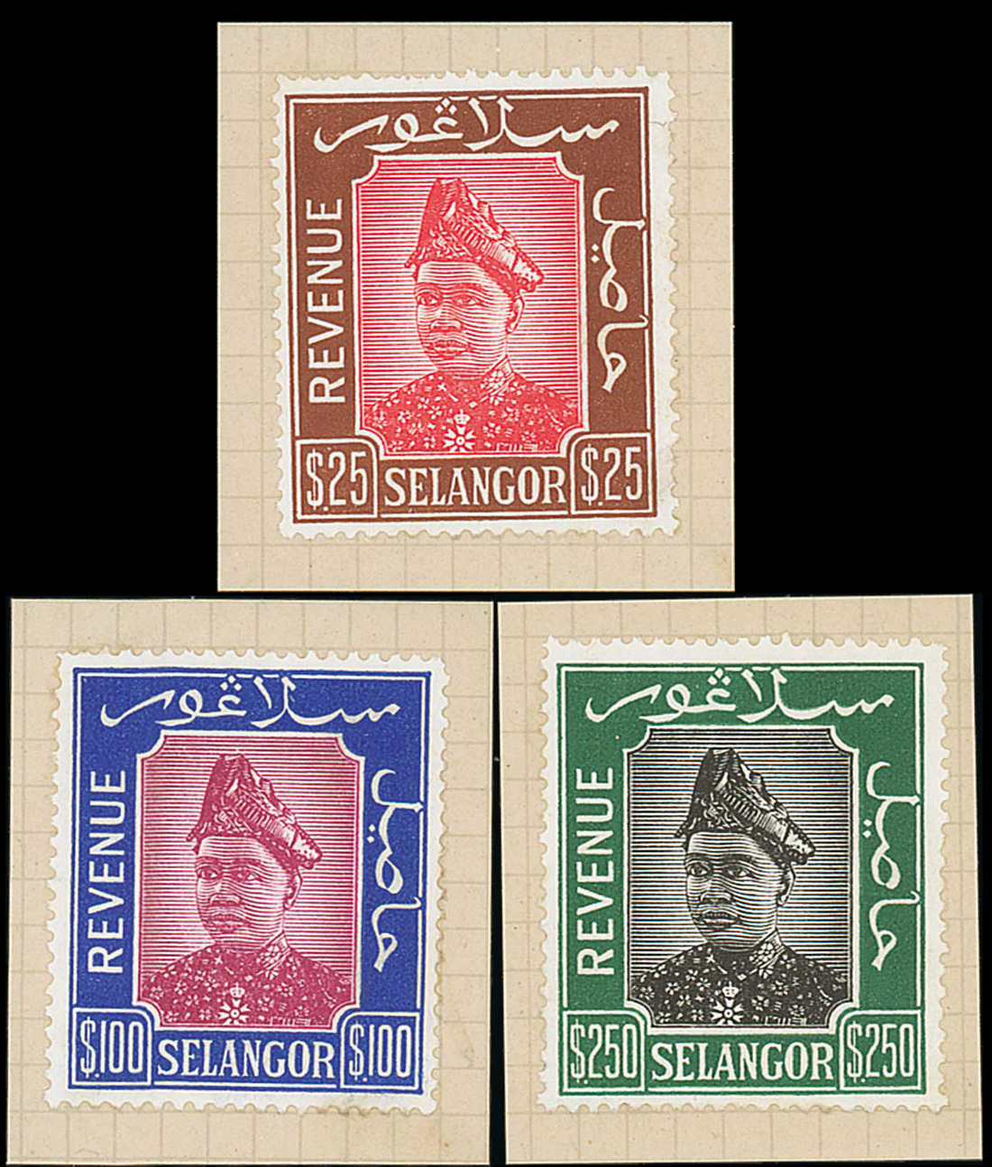 1950 $25 red and brown, $100 purple and blue and $250 black and green, all unused and each affixed to small piece, fine. Barefoot 104-105. Photo