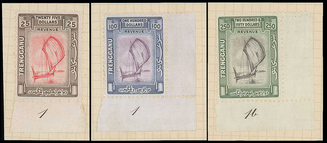 1950 $25 red and deep brown, $100 purple and slate and $250 black and green, each a lower right corner example with plate number ($25 missing right margin), all unused and affixed to small piece, fine. Almost certainly a unique set. Barefoot 5-7. Photo