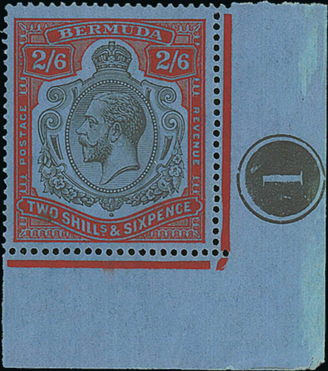 2/6d. black and scarlet-vermilion on deep blue, lower right corner example with plate number, variety gash in fruit and leaf, fresh and lightly mounted mint; small light mark in value tablet at left, othewise fine. S.G. 89jg, £550. Photo