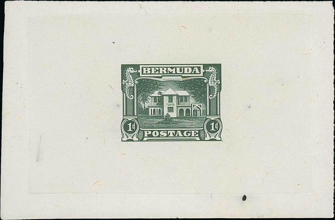 1937 American Bank Note Co. 1d. essay showing Walsingham House, Hamilton Parish, in deep green on wove paper (102x67mm.), fine. The only recorded example. Photo