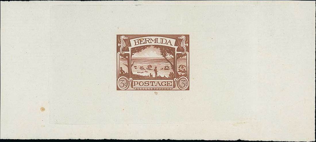 1937 American Bank Note Co. 3d. essay showing Beach Scene on South Shore, in reddish brown on wove paper (113x59mm.), fine. The only recorded example. Photo
