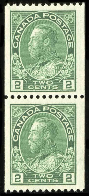 #133, 1924 2c Yellow green, perf. 12 horizontal coil, wet printing, pair, excellent centering, o.g., top stamp h.r., bottom stamp n.h. and a large-margined gem (Unitrade C$420.00).