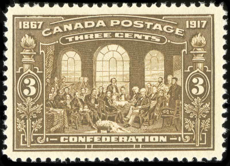 #135, 1917 3c Canadian Confederation, exceptionally large margins for this and beautifully centered within them, o.g., n.h., extremely fine (Unitrade C$210.00).