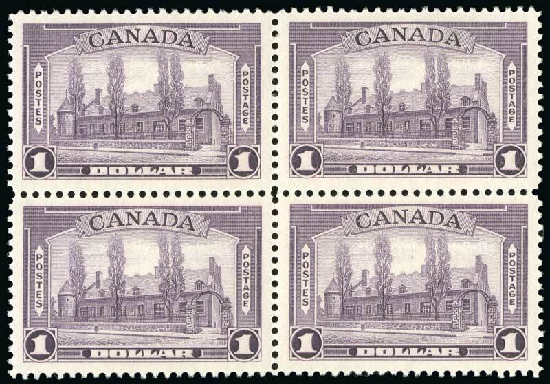 #245, 1938 $1.00 Dull violet, lovely mint block of four, excellent centering, fresh, o.g., n.h., extremely fine; 2007 PF certificate; catalog values are for four singles (Unitrade C$720.00).
