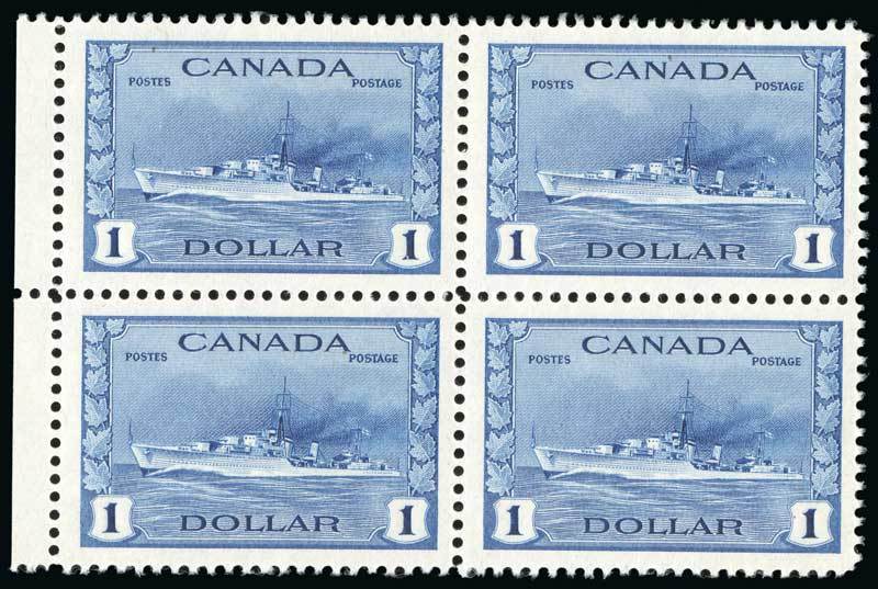 #249-62, 1942-43 1c-$1.00 King George VI War issue cplt., select blocks of four, beautifully centered, o.g., n.h. very fine to mostly extremely fine; catalog values are four four sets of singles (Unitrade C$1,200.00).