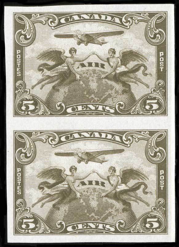 #C1P, 1928 5c Brown olive air post, plate proof on India, handsome vertical pair with full wide even margins all around, extremely fine and elusive with only 300 pairs issued.