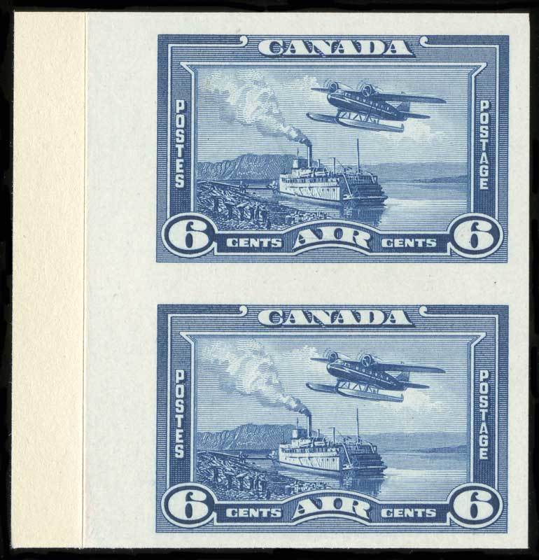 #C6P, 1938 6c Blue air post, plate proof on India, left margin vertical pair on original card backing, the other three sides have wide even margins, extremely fine and scarce with only 200 pairs possible though much less actually because of position pieces.