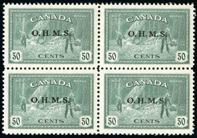 #O9, 1949 50c Lumbering, "O.H.M.S." overprint, select mint block of four, beautiful centering, o.g., n.h., extremely fine; catalog values are for four singles (Unitrade C$1320.00).