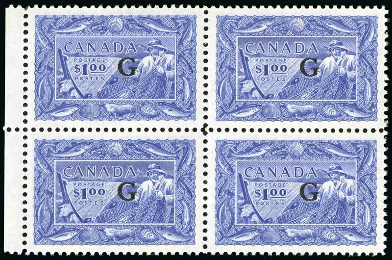 #O27, 1951 $1.00 Fisheries, "G" overprint, left margin mint block of four, mathematically well centered and fresh, o.g., n.h., extremely fine; catalogs values are for four singles (Unitrade C$720.00).