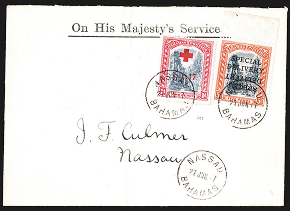 #E1c, 1916 "Special Delivery" overprint on 5d Orange and black, double overprint, one inverted, top sheet-margin single, used along with 1917 1d Carmine & black semi-postal on "On His Majesty's Service" imprint cover, stamps tied by "Nassau/Bahamas/27 June 17" datestamp, with the postmark repeated at bottom, cover with harmless vertical pocket fold, very fine; addressed to Nassau so in all probability a handback usage, but still exceedingly rare on a contemporary cover.