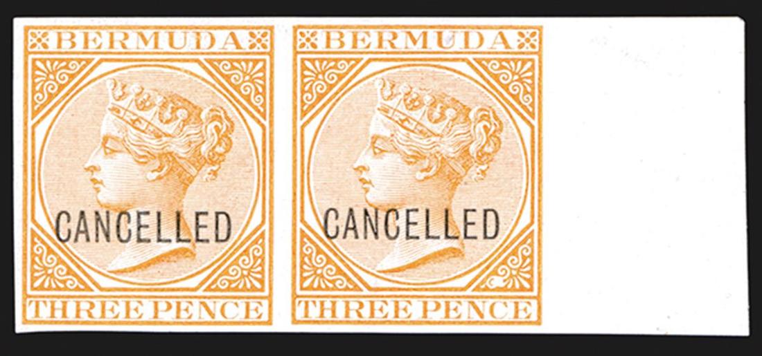 #3P, 1873 3d Buff, plate proof on thick surfaced unwatermarked paper, imperforate, overprinted "Cancelled," right sheet-margin horizontal pair, with large margins on the other three sides, fresh and very fine (S.G. #5P).