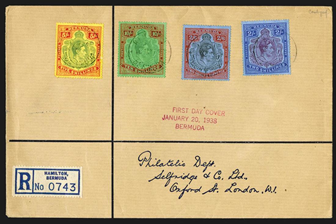 S.G. #116-19, 1938 2/- to 10/- George VI, singles of each of these original shades tied to registered first day cover to London by separate strikes of "Hamilton, Bermuda/20 Jan 38" datestamps, "Registered/Plymouth, Devon/5 Fe 38" backstamp, very fine and rare,