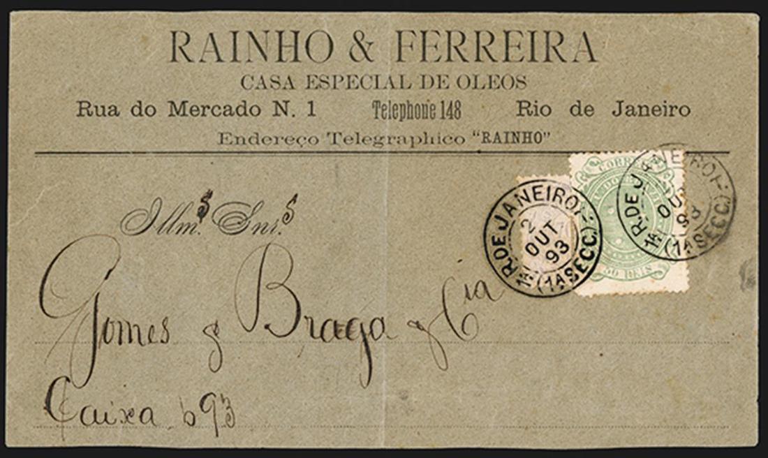 #97 var., 1888 700r Violet, bisect, the left vertical half well tied along with 1890 50r Yellow green (#100b) to merchant's cover by two strikes of "R. de Janeiro/2 Out 93" double circle datestamps to pay the 400r quadruple rate, backstamped in Rio the same day, cover reduced at bottom and with harmless vertical pocket fold, fine; the use of this bisected 700r stamp is very rare; 2002 Sismondo certificate.