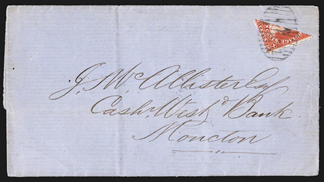 #9a, 1860 10c Vermilion, diagonal half used as 5c, the lower right half well tied across the cut by rare numeral 21 in oval grid cancel to 1860 folded letter to Moncton, entered the mails with "Newcastle, N.B./No 15, 1860" backstamp, very fine; 1984 Greene Foundation certificate (Unitrade C$1,000.00).