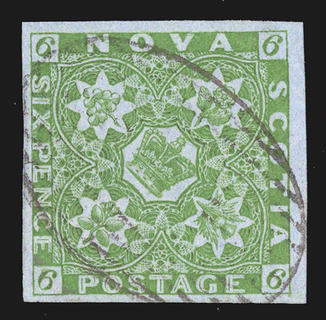 #4, 6d Yellow green, a superb used single, featuring large to huge margins all around, lovely bright color and a sharp impression on fresh paper, light and unobtrusive oval grid cancel, an extremely fine gem with few peers; 2000 and 2007 PF certificates (Unitrade C$1,200.00 for VF).
