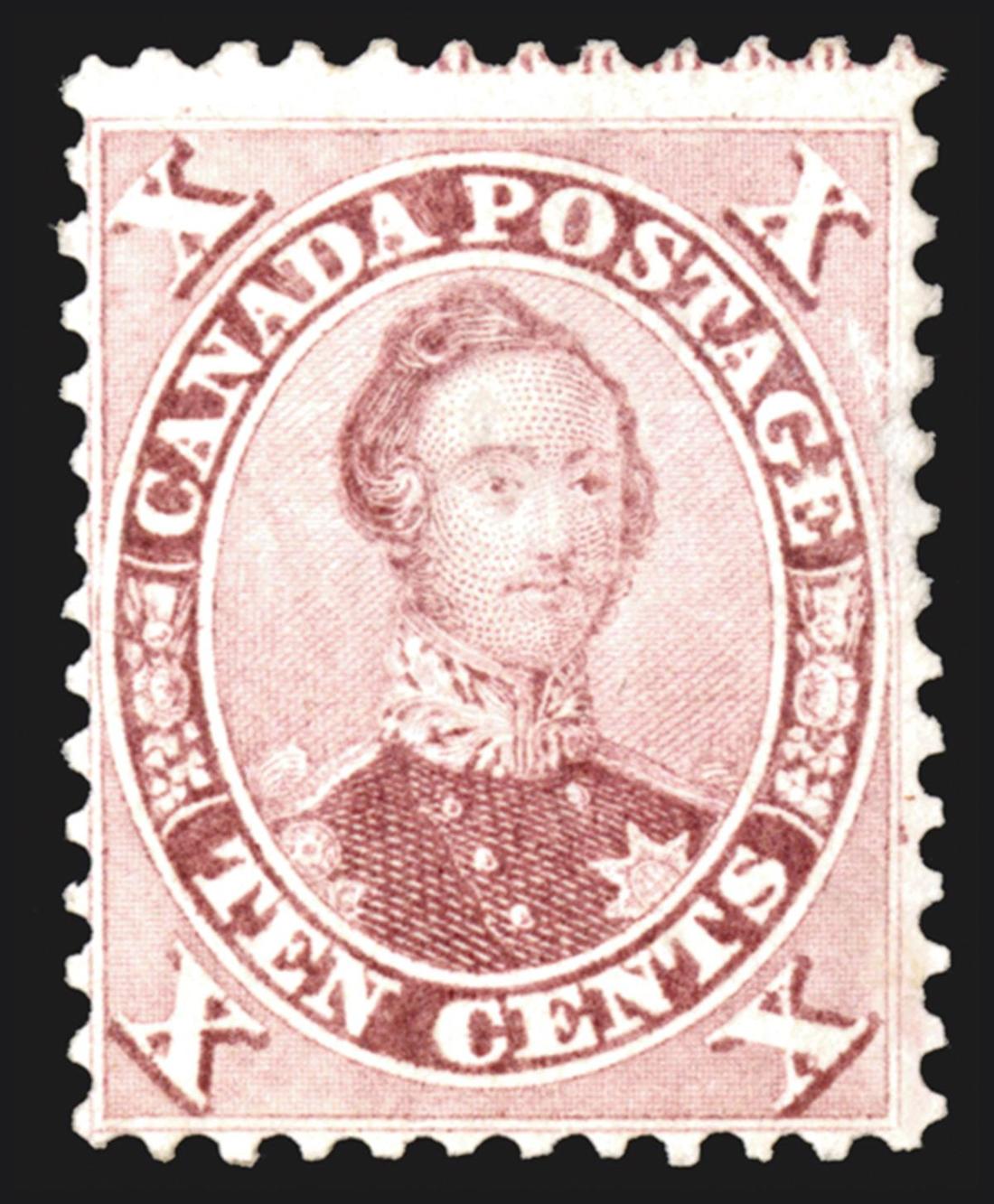 #17, 1859 10c Red lilac, an unusually handsome mint example, with perforations virtually clear of the design all around and showing a small portion of the imprint within the perforations at top, incredibly fresh with especially deep rich color and sharp impression, o.g., fine; an elusive stamp in this quality (Unitrade C$3,000.00).