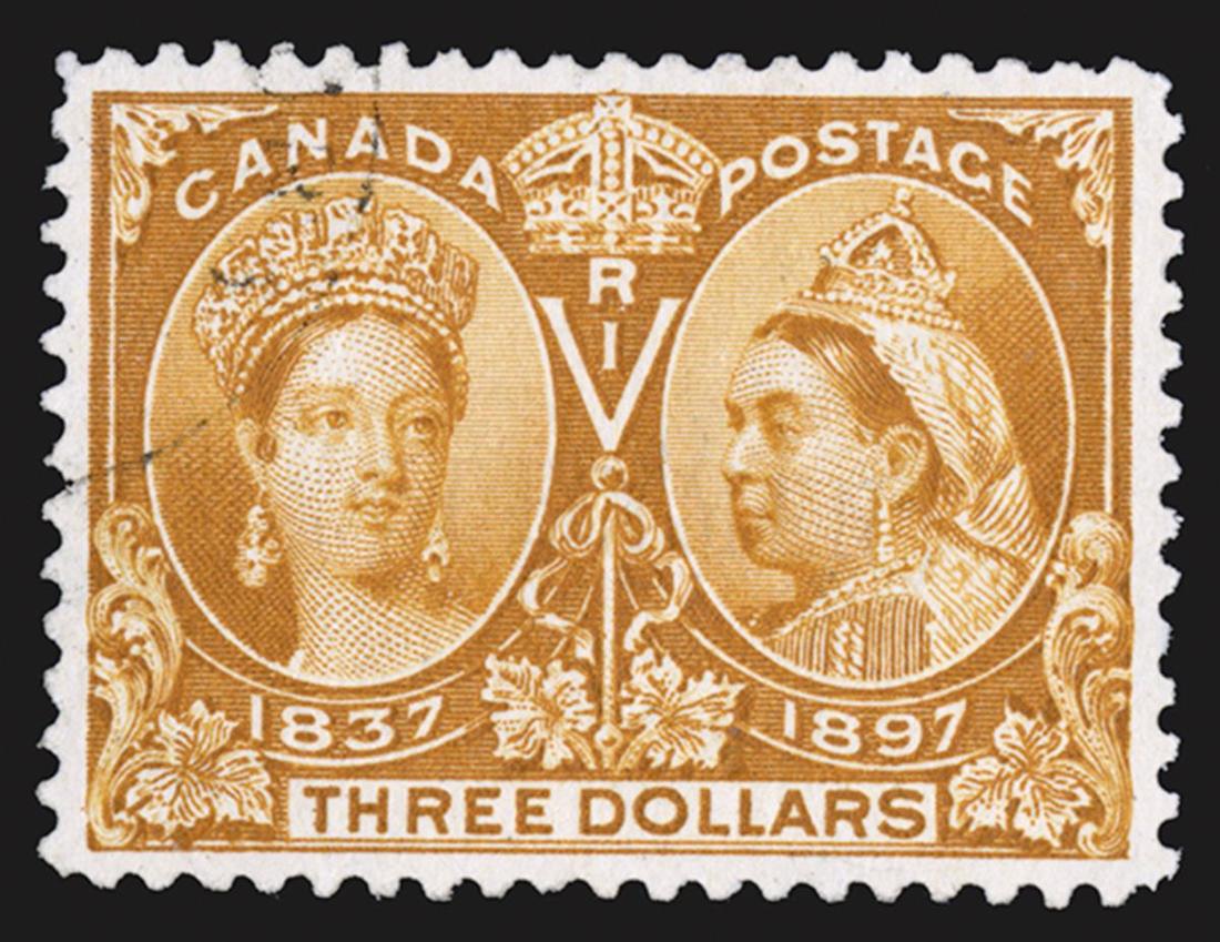 #63, 1897 $3.00 Jubilee, select used example, well centered and fresh, luxuriant color on crisp clean paper, light c.d.s. cancel confined to the top left corner, extremely fine; 2007 PF certificate graded VF-XF 85 (Unitrade C$1,600.00).