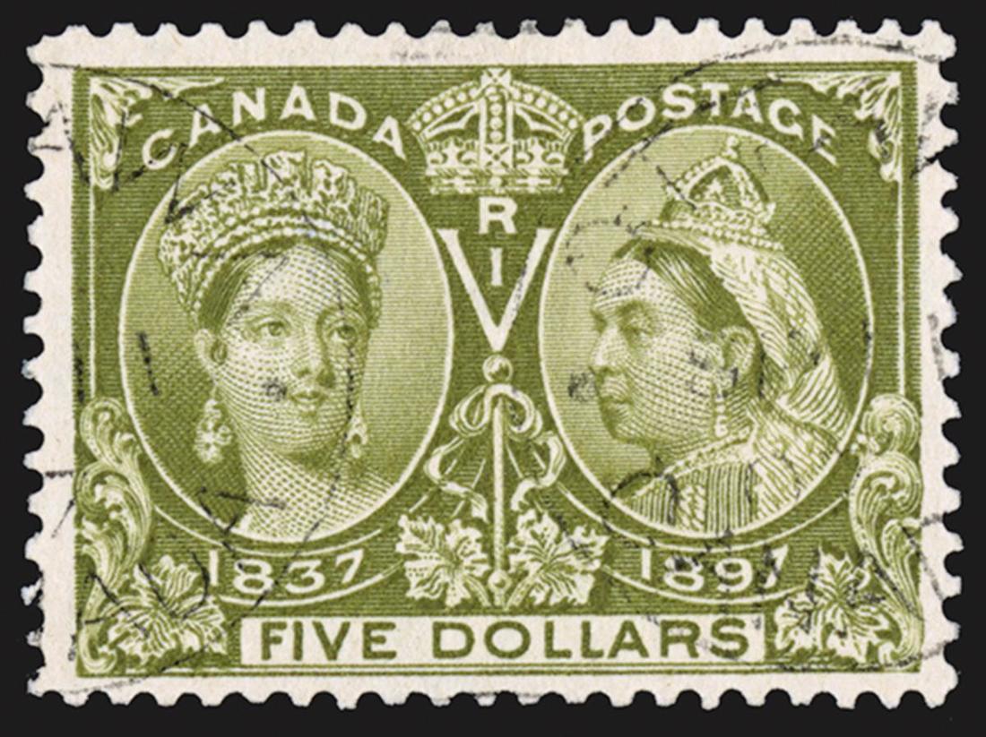 #65, 1897 $5.00 Jubilee, handsome used single, very lightly cancelled by Ottawa c.d.s., attractively centered, fresh and very fine; 2001 Greene Foundation certificate (Unitrade C$1,600.00).