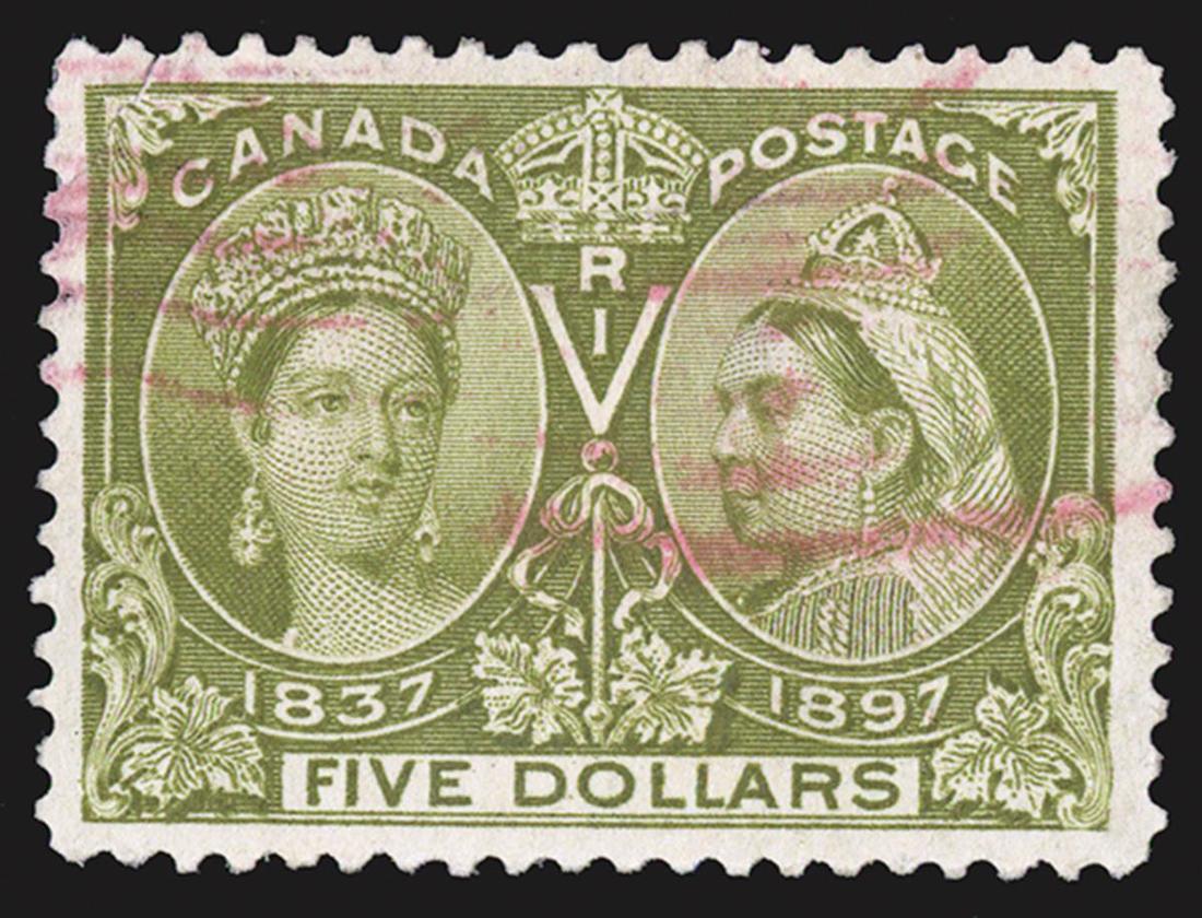 #65, 1897 $5.00 Jubilee, used with magenta wavy line cancel, thinned spot and repaired top left corner, very fine appearance.