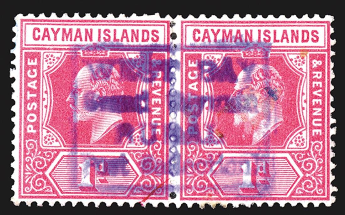 "West Bay/Grand Cayman/Rural/Post Collection" lovely full strike of the this violet boxed handstamp on well centered 1d Carmine horizontal pair (S.G. #26), very fine; an excellent example of this scarcest of all the rural post cancels;