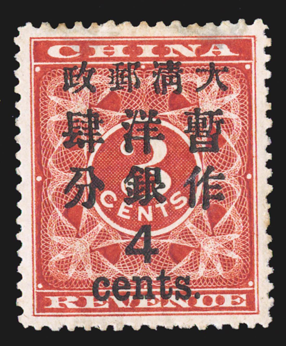 #82, 1897 Large "4/cents." surcharge on 3c Red revenue, well centered, rich color, o.g., small thinned spot, very fine appearance.