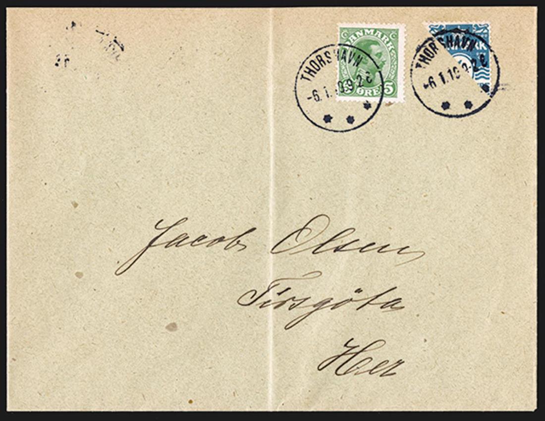 Denmark #88a, 1913 4o Blue, bisect, the upper right diagonal half tied along with 1913 5c Green (#97) by two strikes of "Thorshavn/6.1.19" Faroe Islands datestamp to cover paying the new 7o letter rate, harmless vertical pocket fold, very fine and scarce; these bisects were only in use from 3-23 January, 1919.