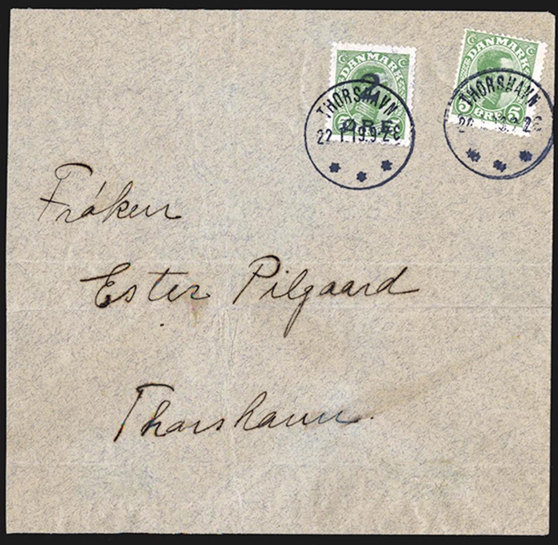 #1, 1919 2o on 5o Green, tied to local cover along with Denmark 1913 5o Green (#97) by "Thorshavn/22.1.1919" datestamp, cover reduced at left and with several folds, the stamp very fine.