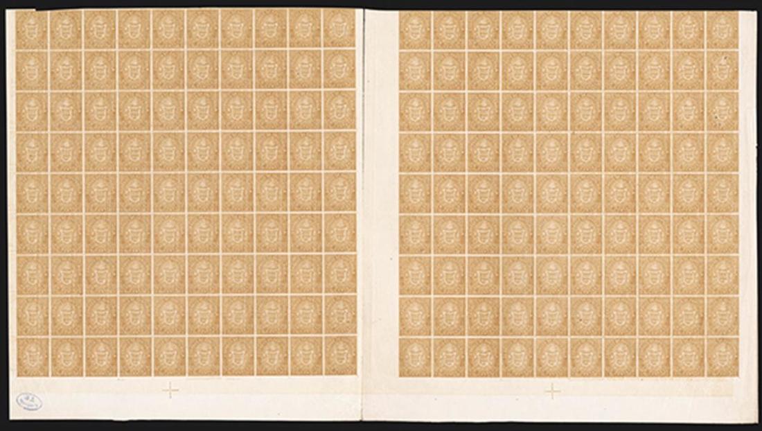 #1a, 1b, 1871 1c Ocher, Imperforate, printed on both sides, an amazing large portion of a double sheet, on one side printed in the deep ocher shade is a gutter block of 180 being the bottom nine rows of each of the two panes with blue "Controle/T.P." handstamp control marking at bottom left, on the reverse of the left block of 90 is printed a block of 90 in the upright position in the ocher shade making a total of 90 stamps printed on both sides and the other block of 90 printed on only one side (two stamps with staple holes), vertical fold in the gutter between panes as always (slight separation of about two rows at top), very fine; this multiple is extraordinary in several ways, the double pane of 180 is larger than full sheet of 150 and therefore the second largest multiple recorded, being only smaller than the full double sheet of 300; this is also believed to be the largest recorded multiple printed on both side; all of this makes for a very valuable multiple with a total catalog value of $6,975.00 for just the printed-on-reverse singles and imperforate pairs, let alone the premium for this impressive multiple.