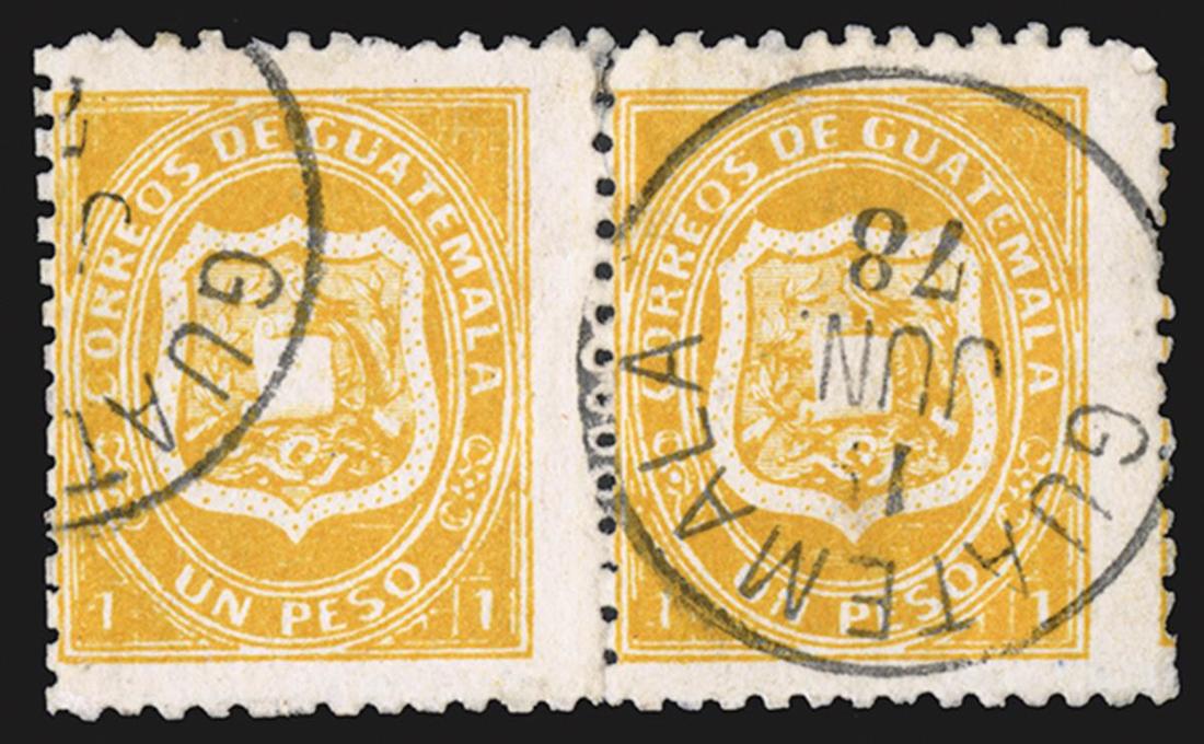 #6, 1873 1P Dull yellow, horiz. pair, right stamp type 98, with "Guatemala/1 Jun 78" central c.d.s. on the right stamp and a portion on the left stamp, strong color, centered to left as most of this issue are poorly centered, trivial perf flaw at top, fine; extremely rare with only seven horizontal pairs recorded by Walter Lind, the eminent student of this issue, and this pair noted as being owned but not illustrated by Goodman, a pair is the largest known used multiple;