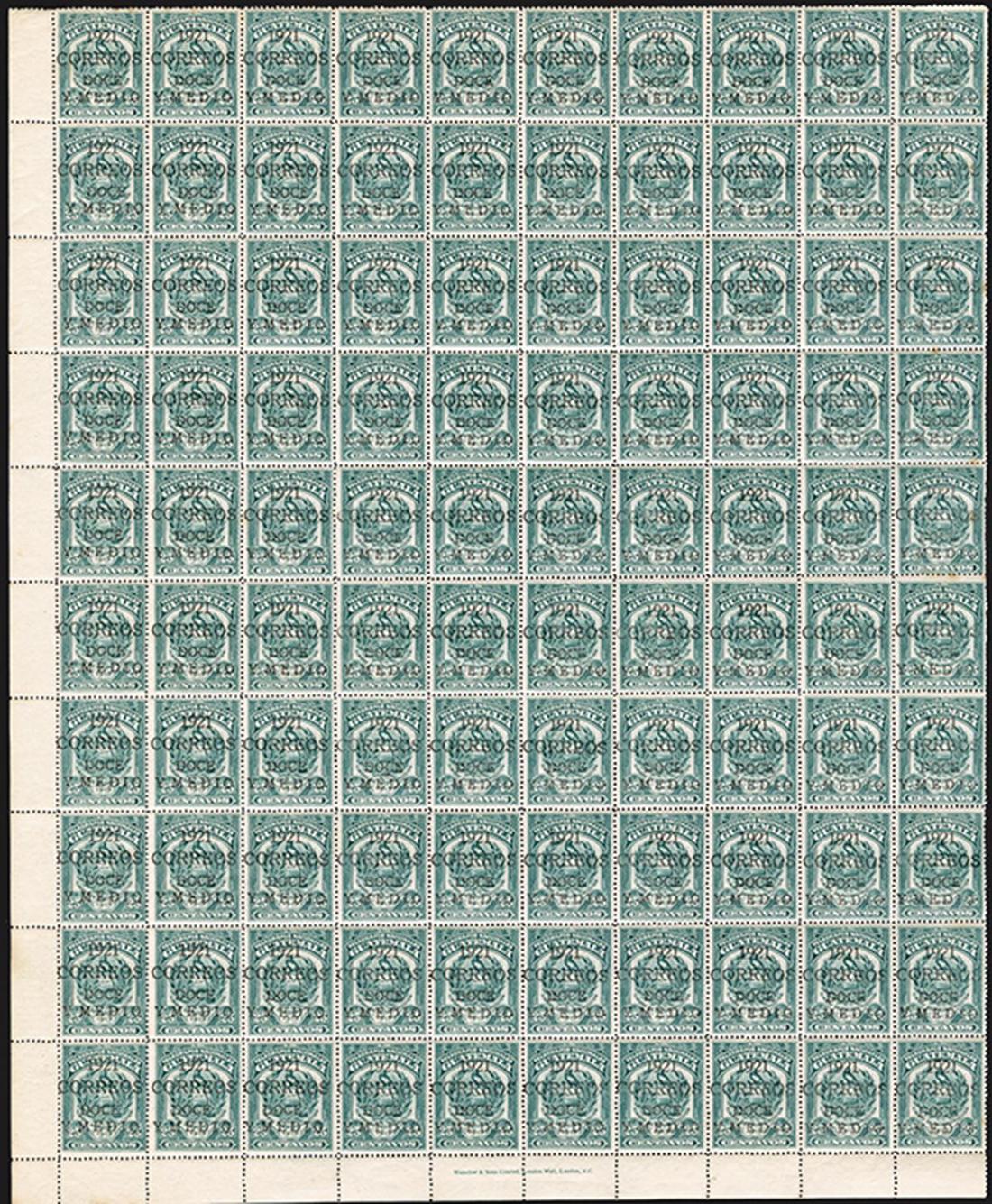 #177, 1921 12½c on 25c Green with black surcharge, group of four complete sheets of 100, each with selvage at left and bottom with bottom "Waterlow & Sons Limited, London Wall, London, E.C." inscription for the basic 25c Green telegraph stamp, the surcharge shows different types having to do with the alignment of "Doce", all with o.g., never hinged, a few spots of gum toning on the reverse and two sheets have perforation flaws or clipped perforations on the sides without selvage, fine-very fine and excellent for plating; this 12½ black surcharge is the scarcest of this telegraph issue overprinted for postal use making this a valuable lot with Scott catalog value $6,000.00 for just singles.