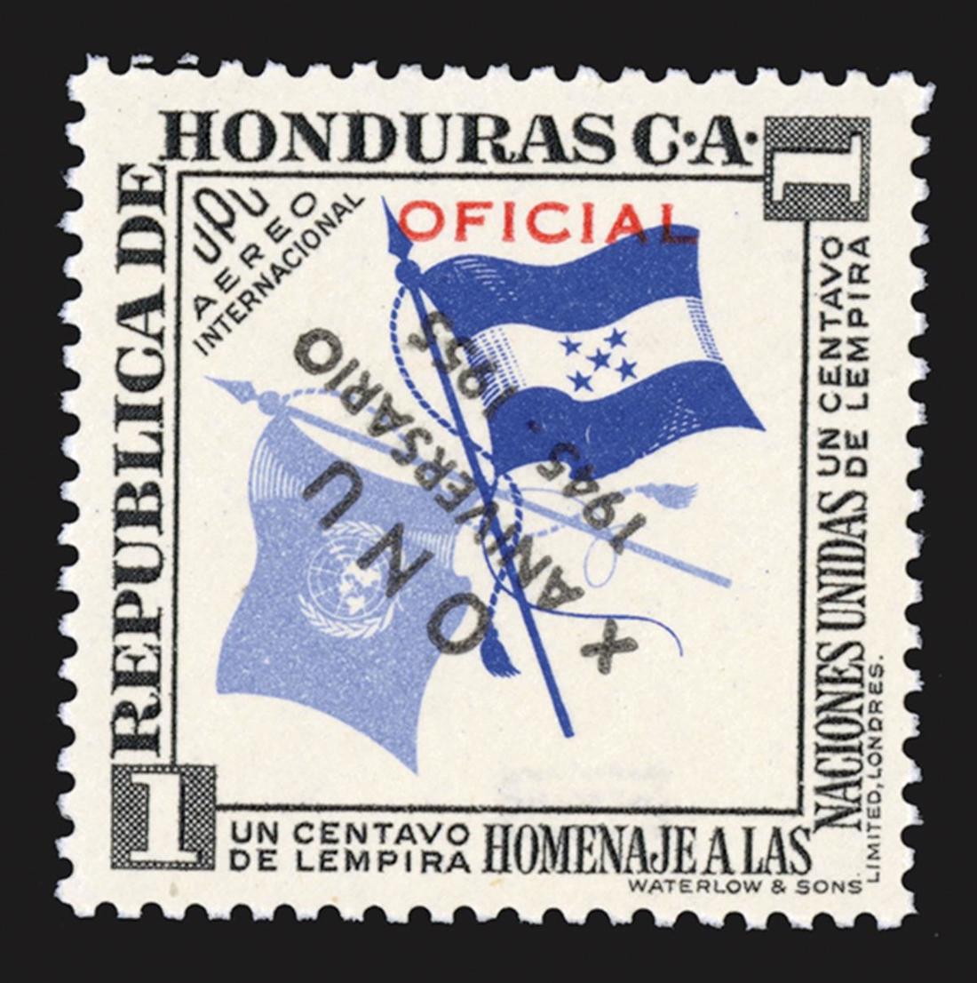 #C241 Footnote, 1953 1c "ONU/X Aniversario/1945-1955" overprint on 1c Ultramarine and violet blue official, inverted overprint, o.g., n.h., extremely fine and very rare as only 25 copies were discovered; signed Kessler and Sanabria.