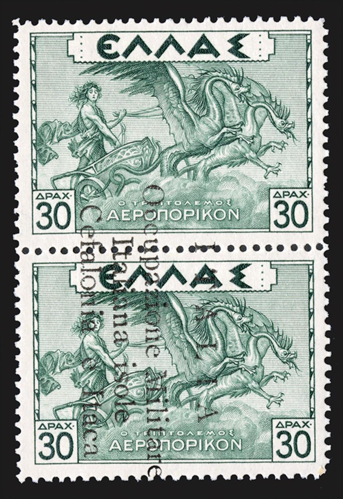 #NC4, 1941 30D Dark green, vertical occupation overprint reading down on vertical pair, crisp and intact, o.g., n.h., extremely fine and scarce; signed Kessler.