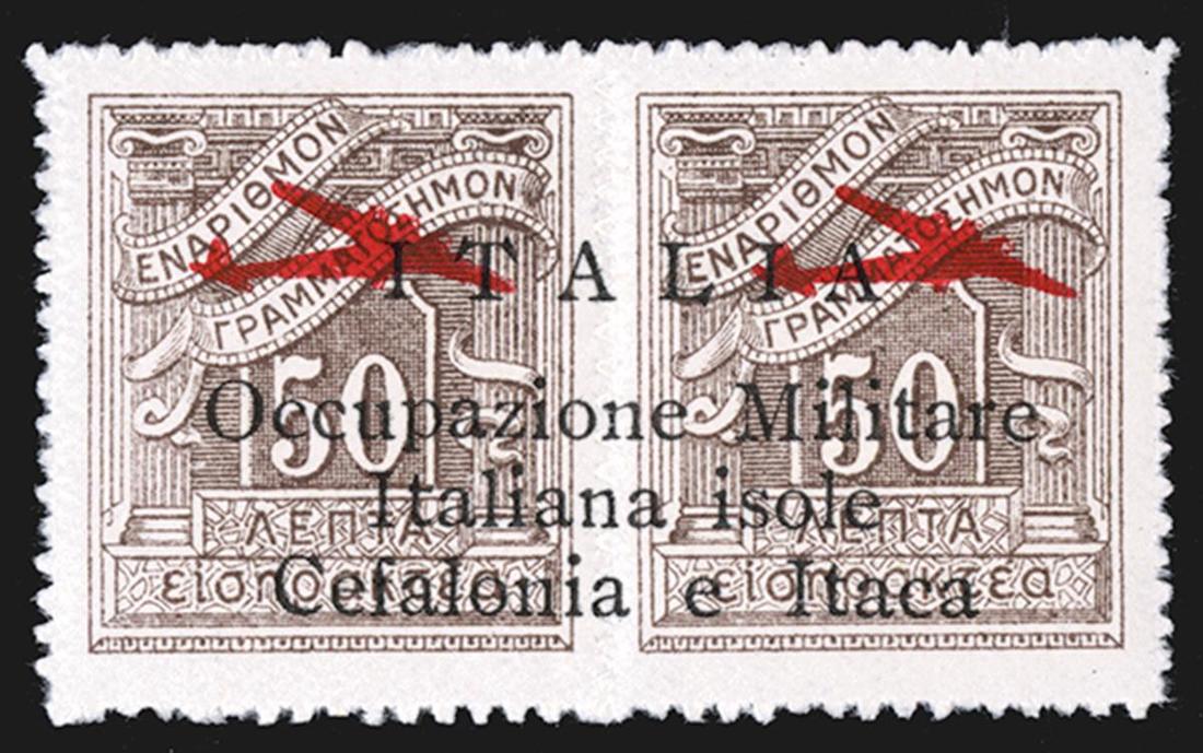 #NC11, 1941 50l Violet brown postage due with air mail overprint and horizontal occupation overprint on horizontal pair, beautifully centered, pristine o.g., n.h., extremely fine and rare; signed Kessler.