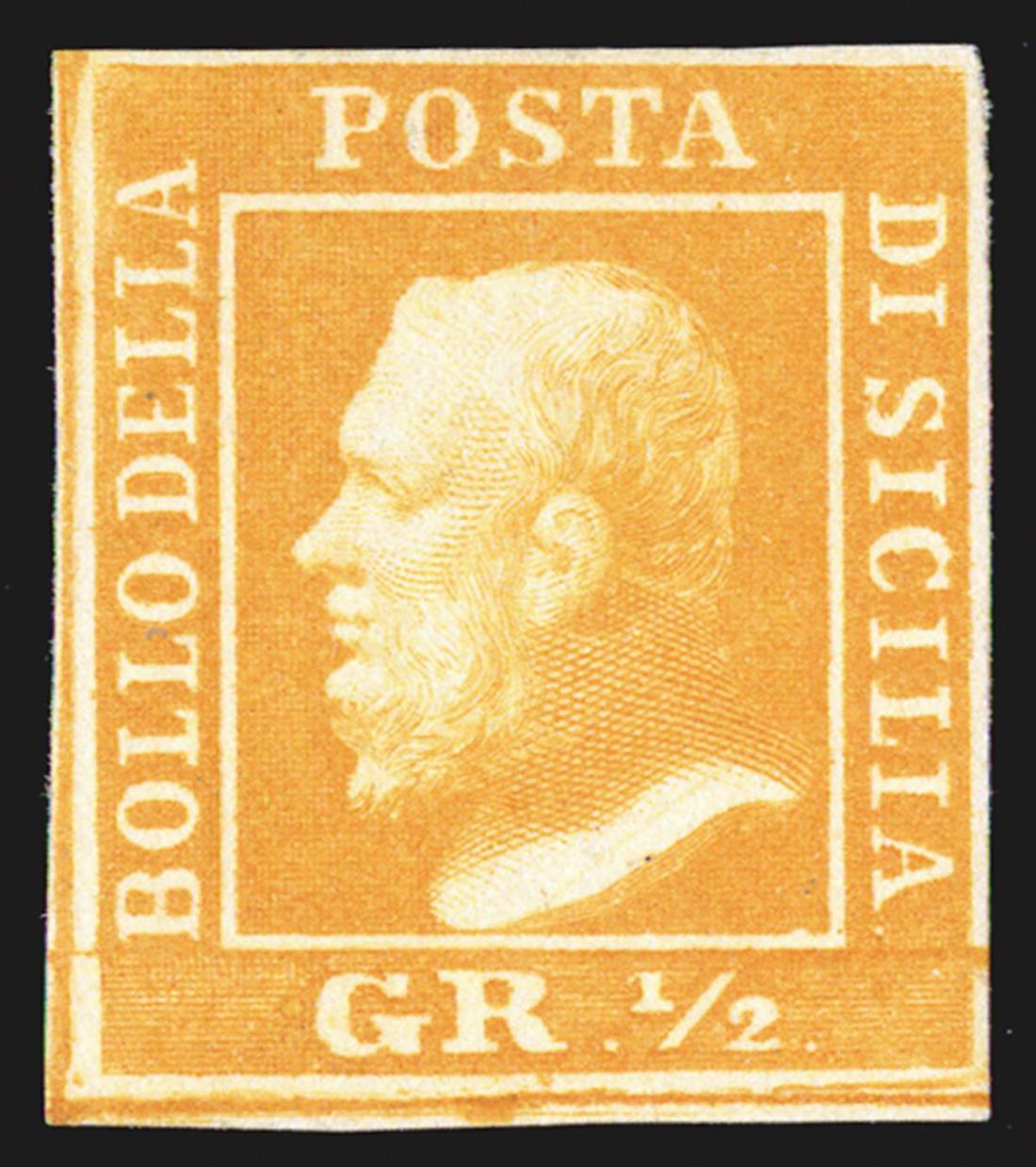 #10g, 1859 ½g Orange, Palermo consignment, ample to large margins all around, including outer frame line at left and bottom, vivid rich color and wonderfully fresh, full clean o.g., small h.r., very fine and choice; signed "ED" (Diena) and Raybaudi and accompanied by the latter's 2013 certificate (Sassone #2; €1,200).