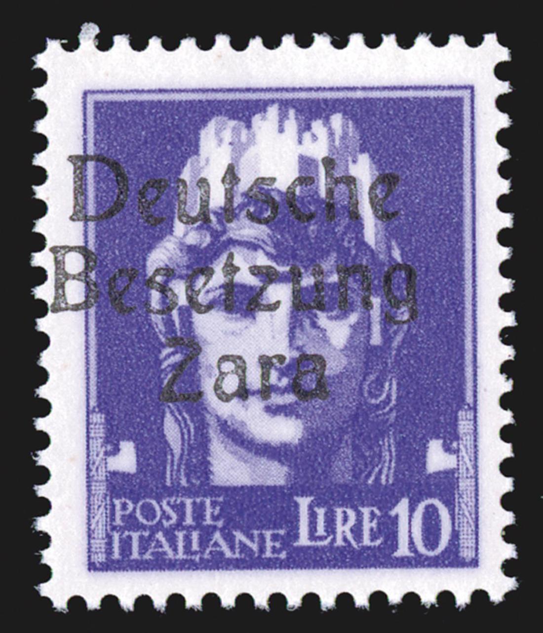 Sassone #16, 1943 10L Violet with "Deutsche/Besetzung/Zara" overprint, post office fresh, o.g., n.h., very fine; signed "AD" (Diena).